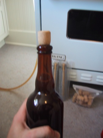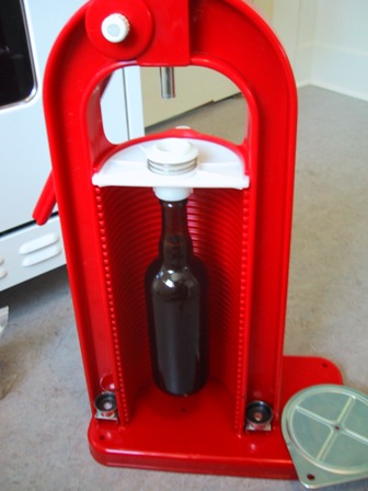 Okay, here’s where it gets interesting. The cork holder on the corker is like a funnel so that it compresses the cork before pushing it into the bottle. When you only press the cork in part of the way you’re left with the cork still in that funnel bit. So how did I deal with it? Well I removed the base from under the bottle so the corking mechanism no longer had leverage to push the cork into the bottle. I could then hold the bottle to prevent it from falling and then turn the lever to it’s full extent, pushing the cork through the cork holder without pushing it any further into the bottle.
